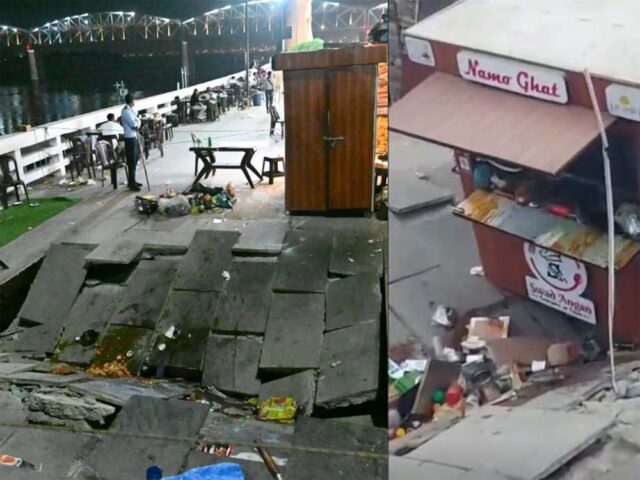 वाराणसी के सबसे प्रसिद्ध नमो घाट पर बुधवार की शाम जमीन धंसने से हड़कंप मच गया। जिस जगह पर जमीन धंसी वहां कई दुकानें भी लगीं थीं। जमीन के साथ ही दुकानें भी एक तरफ लुढ़क गईं। इससे दुकानदार और ग्राहक भाग खड़े हुए। अचानक हुए हादसे से अफरातफरी मच गई। फिलहाल वहां मौजूद सुरक्षाकर्मियों ने रस्सी की बैरिकेडिंग लगाकर लोगों का आना-जाना बंद कर दिया है। हादसे की जानकारी मिलते ही कार्यदायी संस्था और नगर निगम के अधिकारी भी घटना का जायजा लेने के लिए रवाना हो गए हैं।