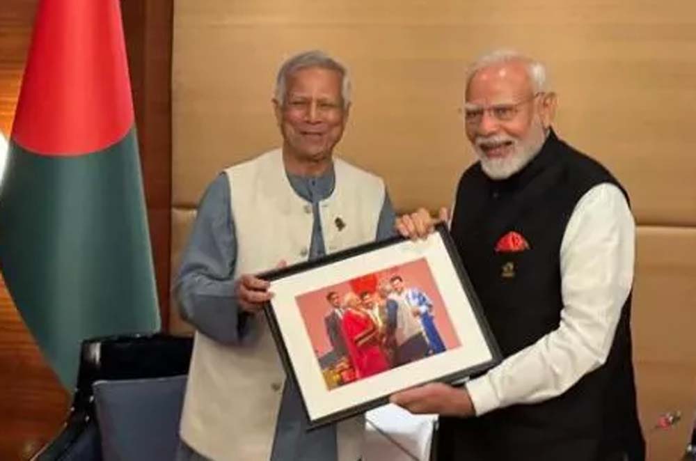 सोशल मीडिया प्लेटफॉर्म एक्स पर प्रोफेसर यूनुस के कार्यालय ने एक पोस्ट साझा की है। इस पोस्ट दो फोटो शेयर की गई है। इस पोस्ट में लिखा गया है कि प्रोफेसर मोहम्मद यूनुस शुक्रवार को बैंकॉक में अपनी द्विपक्षीय बैठक के दौरान प्रधानमंत्री नरेंद्र मोदी को एक तस्वीर पेश कर रहे हैं। यह तस्वीर प्रधानमंत्री नरेंद्र मोदी द्वारा 3 जनवरी, 2015 को 102वें भारतीय विज्ञान कांग्रेस में प्रोफेसर यूनुस को स्वर्ण पदक प्रदान करने के बारे में है।