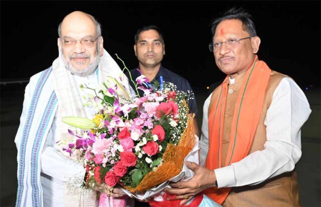 केंद्रीय गृह मंत्री अमित शाह का उपमुख्यमंत्री अरुण साव, उपमुख्यमंत्री विजय शर्मा, वित्त मंत्री ओ.पी. चौधरी, कृषि मंत्री रामविचार नेताम, केंद्रीय राज्य मंत्री तोखन साहू, सांसद बृजमोहन अग्रवाल, विधायक पुरंदर मिश्रा, विधायक अनुज शर्मा ने पुष्पगुच्छ भेंटकर स्वागत किया।