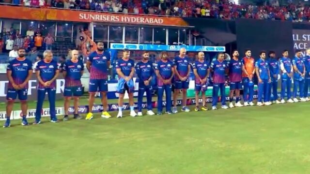 इंडियन प्रीमियर लीग (IPL) में आज मुंबई इंडियंस और सनराइजर्स हैदराबाद की टक्कर हो रही है. लेकिन इस मैच में खिलाड़ी और अंपायर काली पट्टी पहनकर मैदान में उतरे हैं. दरअसल, पहलगाम में हुए आतंकी हमले के बाद ये फैसला लिया गया है. ये बदलाव पहलगाम में मारे गए लोगों को श्रद्धांजलि देने के लिए किया गया है. इस मैच में टॉस जीतकर हार्दिक पंड्या ने पहले गेंदबाजी का फैसला लिया है.