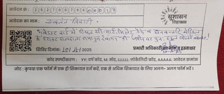 अब देखना यह हैं कि शासन-प्रशासन द्वारा सुशासन तिहार में पहुंचें इस आवेदन पर क्या कार्यवाही किया जाता हैं।