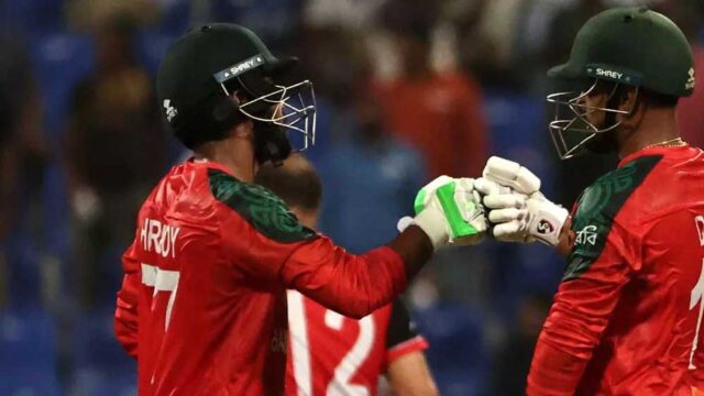 फिर कप्तान यासिम मुर्तजा और निजाकत खान ने चौथे विकेट के लिए 46 रनों की पार्टनरशिप की, जिसने हॉन्ग कॉन्ग को सम्मानजनक स्कोर तक पहुंचाने में मदद की. निजाकत ने 40 गेंदों का सामना करते हुए 42 रन बनाए, जिसमें दो चौके के अलावा एक सिक्स शामिल रहा. वहीं यासिम मुर्तजा ने 2 छक्के और 2 चौके की मदद से 19 बॉल पर 28 रनों का योगदान दिया. बांग्लादेश की ओर से तस्कीन अहमद, तंजीम हसन साकिब और रिशाद हुसैन ने दो-दो विकेट झटके.