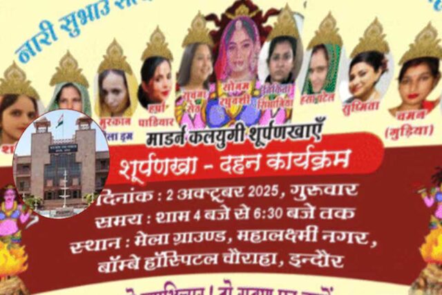 मध्य प्रदेश के इंदौर में होने वाले विजयादशमी पर शूर्पणखा के पुतला दहन पर एमपी हाईकोर्ट ने बड़ा फैसला दिया है. बता दें कि 2 अक्टूबर को होने वाले शूर्पणखा के पुतला दहन पर रोक लगा दी है. बता दें कि सोनम की मां संगीता रघुवंशी ने एक शूर्पणखा के खिलाफ एक याचिका दायर की थी. इस पर शुक्रवार को हाईकोर्ट ने सुनवाई करते हुए शूर्पणखा के पुतला दहन पर रोक लगाने के आदेश दिए हैं. इस आदेश की कॉपी शनिवार को सामने आई है.