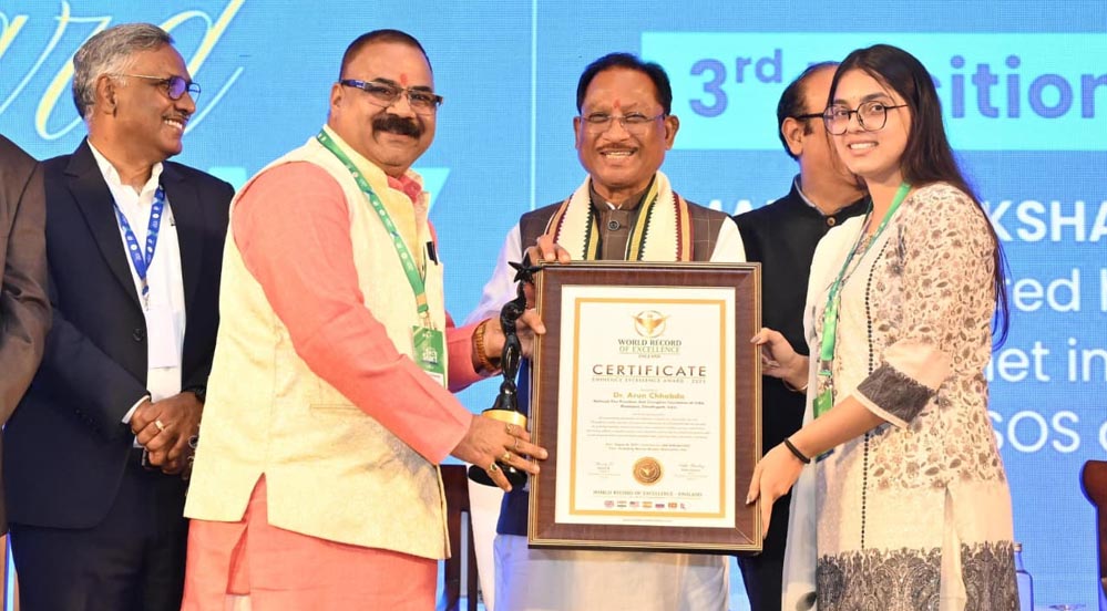 मुख्यमंत्री विष्णु देव साय ने एग्रोफेब सस्टेनेबल स्टार्टअप के लिए करण चंद्राकर, वर्टेक्स सुइट के लिए सजल मल्होत्रा और लैरक एआई के लिए अमित पटेल को सम्मानित किया।