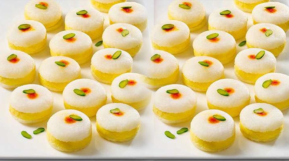 केले के पत्तों को एक डिब्बे का रूप दें। चपटे रसगुल्ला छेने को बीच से बराबर-बराबर दो भागों में काट लें। एक भाग संदेश में केसर दूध, कटे मेवा, पिसी इलायची डालकर अच्छे से मिला, उन्हें आठ भागों में बांट लें। संदेश के दूसरे भाग में भी दूध डाल मुलायम पेस्ट बना लें। केसर-संदेश मिश्रण को छेना रसगुल्ले के बीच में रख उसे केले पत्ते के डिब्बे में रखें। प्रत्येक डिब्बे में ऊपर से संदेश दूध मिश्रण भरें। चांदी का वर्क लगे पिस्ता और केसर रंग से सजाकर परोसें।