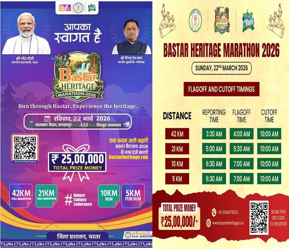 छत्तीसगढ़ में खेलों को बढ़ावा देने और बस्तर की सांस्कृतिक विरासत को राष्ट्रीय मंच पर लाने के उद्देश्य से “बस्तर हेरिटेज मैराथन 2026” का आयोजन किया जा रहा है। मुख्यमंत्री विष्णु देव साय के नेतृत्व में यह आयोजन राज्य के लिए एक ऐतिहासिक पहल माना जा रहा है। 22 मार्च को आयोजित होने वाली यह मैराथन जगदलपुर के लालबाग मैदान से प्रारंभ होकर चित्रकोट जलप्रपात तक पहुंचेगी। यह रूट प्रतिभागियों को बस्तर के प्राकृतिक और ऐतिहासिक सौंदर्य से रूबरू कराएगा।