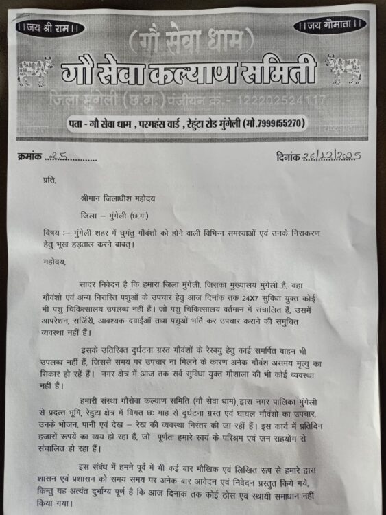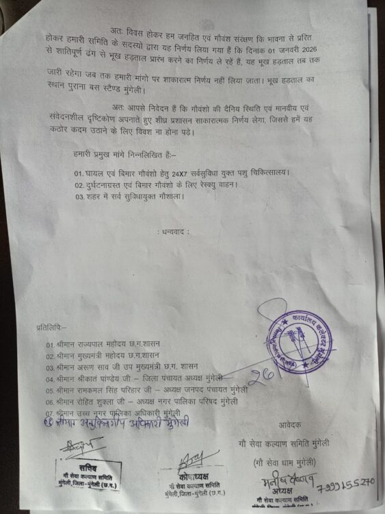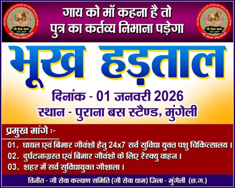 मुंगेली/ शहर एवं जिले में दुर्घटनाग्रस्त व बीमार गौवंशों के उपचार हेतु समुचित स्वास्थ्य सुविधाओं के अभाव को लेकर गौ सेवा कल्याण समिति (गो सेवा धाम) ने आंदोलन का ऐलान कर दिया है। समिति ने जिला प्रशासन को ज्ञापन सौंपते हुए स्पष्ट किया है कि यदि शीघ्र ठोस एवं स्थायी निर्णय नहीं लिया गया, तो दिनांक 1 जनवरी 2026 को भूख हड़ताल की जाएगी।