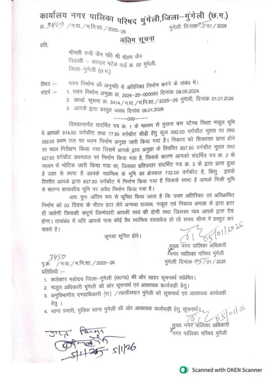 मुख्य नगर पालिका अधिकारी (CMO) द्वारा जारी इस ‘अंतिम सूचना’ में निर्देशित किया गया है कि अतिरिक्त और अतिक्रमित हिस्से को 03 दिवस के भीतर स्वयं हटा लें। समय सीमा समाप्त होने के बाद प्रशासन द्वारा बुलडोजर की कार्रवाई की जाएगी। कार्रवाई में होने वाले समस्त व्यय की जिम्मेदारी भवन स्वामी की होगी। यदि संबंधित पक्ष के पास कोई वैध दस्तावेज हैं, तो वे इसे तत्काल प्रस्तुत कर सकते हैं। इस मामले की प्रतिलिपि कलेक्टर मुंगेली, नजूल अधिकारी, अनुविभागीय दंडाधिकारी (SDM) और थाना प्रभारी को भी आवश्यक कार्रवाई हेतु भेज दी गई है। इस कार्रवाई से शहर के अन्य अवैध निर्माणकर्ताओं में हड़कंप मचा हुआ है।
